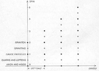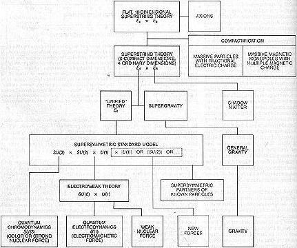 Particles carrying the forces assciated with the extra E8 symmetry are neutral with respect to the observed Yang-Mills forces, but they should exert gravitational attraction. It has been speculated that matter made up such particles, which has been called shadow matter, might account for part of the unseen mass known to be present in the universe. One immediate prediction of the interpretation of superstring theory the existence of a particle called the axion. Such a particle has been postulated in order to avoid a violation of important symmetry in QCD, the theory of the strong interaction. Although the axion has not yet been found, several groups of investigators are planning experiments that could detect it. Many other physical consequences follow from purely topological properties of the six curled-up dimensions. For example, one of the most basic topological properties of a space is the Euler number. If the curled-up space were two-dimensional, the Euler number would be 2 minus twice the genus of the surface, where the genus is the number of holes. In six dimensions the Euler number is less easy to describe. The observed fermions are naturally grouped into "generations" of quarks and leptons [see illustration, on page 46 (The leptons are fermions that do not strongly interact.) Three generations have been discovered so far, and the is probably at most one more. The predicted number of generations is half the Euler number of the six-dimensional compact space.