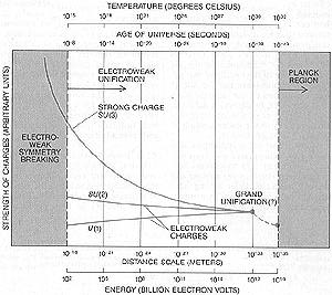 According to current thinking about the origins of the universe, these temperatures were realized only between 10^-43 and 10^-38 second after the big bang. In spite of the brevity of this period, its implications for the subsequent evolution of the universe have been profound. In this way it turns out that the physics of the incomparably small is a key to the understanding of phenomena on a cosmic scale. Many of the new grand-unified theories also incorporated supersymmetry, a symmetry that transforms bosons and fermions into one another and thereby unifies particles having integer and half-integer spin. In a supersyrumetric theory there are equal numbers of bosons and fermions for any given mass. Several recent attempts have been made to combine Einstein's theory of gravity with supersymmetry. The resulting so-called supergravity theories belong to a new kind of gauge theory in which the gauge particle responsible for svpersymmetry is called the gravitino; its spin is 3/2. The most popular supergravity theory for a time was formulated in 11 spacetime dimensions: the four ordinary spacetime dimensions and seven additional spatial ones.