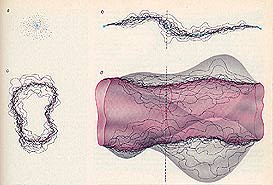 Up to now I have discussed the string as a classical particle. In quantum mechanics the motion of a particle is not precisely defined. When it moves through space, any particle tries, in effect, to take all possible paths between its initial state and its final state. The probability of each path is weighted so that a higher probability is assigned to paths of lower action; the classical path of least action is the most probable one. This formulation of the quantum behavior of a particle is called the method of summing over histories, and it was devised by Richard P. Feynman of Caltech. Its application to string theory has been most completely developed by Stanley Mandelstam of the University of California at Berkeley and by Alexander M. Polyakov of the Landau Institute for Theoretical Physics near Moscow. In superstring theory summing over histories requires summing over all the possible surfaces that join the initial and final states of a string or a set of interacting strings. The different paths can be thought of as fluctuations of the world sheet, which are just like the random, shimmering motions of a soap film at any temperature above absolute zero [see illustration above]. An important quantum-mechanical constraint on string theories was formulated in 1972 by Richard Brower of Boston University, Peter Goddard of the University of Cambridge and Charles B. Thorn of the University of Florida at Gainesville: Requiring symmetry under relabelings of the worldsheet coordinates of a free string undergoing quantum fluctuations is sufficient to determine the number of dimensions of the background spacetime in which the string is moving. Remember that in the original dual-resonance theory the number of spacetime dimensions is 26; in superstring theory 10 dimensions are required. This result had been intimated a year earlier in work by Claud W. V. Lovelace of Rutgers University. The constraint is a striking instance of how the formulation of the theory in terms of the twodimensional world sheet leads to a rich and highly determined structure for the space in which the string is moving.