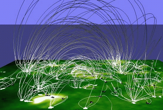 In the picture below the black blobs are south poles and the white blobs are north poles. The magnetic field is drawn as lines joining the black and white blobs. They form a tangled mess of spaghetti, called the Sun's 'magnetic carpet'. This completely changes every two days.