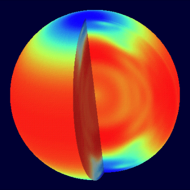 Here is a beautiful image showing the differences in the speed of rotation of material in the Sun. The Sun does not rotate like a solid object, but with SOHO we can find out how the Sun is rotating inside.