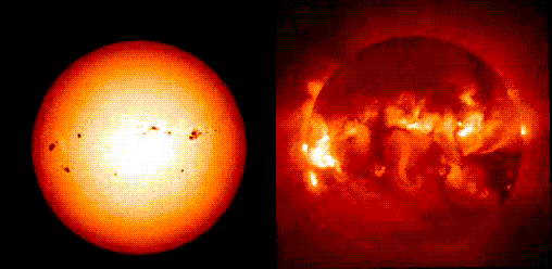 The left hand picture is a normal photograph of the Sun, in visible light. The X-ray photograph on the right from YOHKOH shows the hot corona.