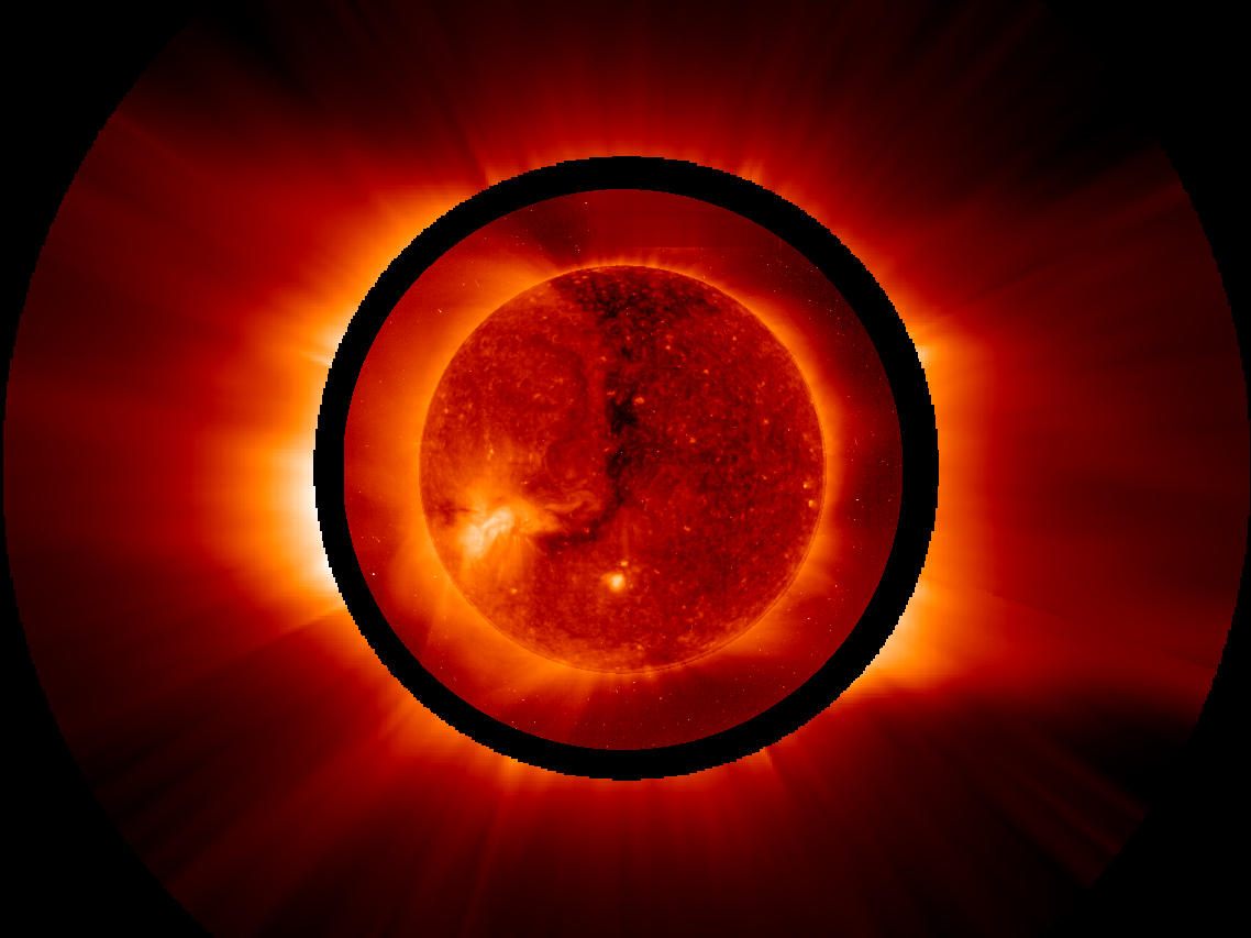 Above is an image, or rather a montage of two images from SOHO. The inner image of the Sun is taken by EIT in ultraviolet light, which shows plasma at around one million degrees. The outer image is from UVCS and shows the corona.