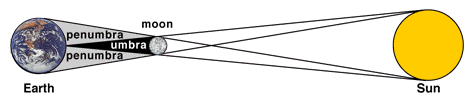This picture shows how the Sun, Moon and Earth line up during a total Solar eclipse. From anywhere in the penumbra, you will see (remember - with a special filter!) some part of the Sun shining from behind the Moon while people within the umbra will witness a total eclipse.