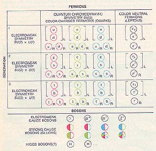 Particles carrying the forces assciated with the extra E8 symmetry are neutral with respect to the observed Yang-Mills forces, but they should exert gravitational attraction. It has been speculated that matter made up such particles, which has been called shadow matter, might account for part of the unseen mass known to be present in the universe. One immediate prediction of the interpretation of superstring theory the existence of a particle called the axion. Such a particle has been postulated in order to avoid a violation of important symmetry in QCD, the theory of the strong interaction. Although the axion has not yet been found, several groups of investigators are planning experiments that could detect it. Many other physical consequences follow from purely topological properties of the six curled-up dimensions. For example, one of the most basic topological properties of a space is the Euler number. If the curled-up space were two-dimensional, the Euler number would be 2 minus twice the genus of the surface, where the genus is the number of holes. In six dimensions the Euler number is less easy to describe. The observed fermions are naturally grouped into "generations" of quarks and leptons [see illustration, on page 46 (The leptons are fermions that do not strongly interact.) Three generations have been discovered so far, and the is probably at most one more. The predicted number of generations is half the Euler number of the six-dimensional compact space.
