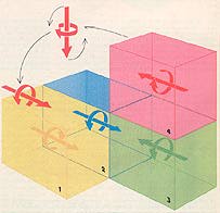 In the early 1970's there was a great resurgence of interest in quantum field theories based on point particles. As recently as 20 years ago the only successful quantum field theory was the quantum theory of electromagnetism I mentioned above, known as quantum electrodynamics, or QED. Yet only a few years later two more highly successful quantum field theories had been developed: the electroweak theory, which gives a unified description for both electromagnetism and the weak interaction, and quantum chromodynamics, or QCD, which describes how quarks bind together to form hadrons. These theoretical achievements were confirmed by remarkable experimental discoveries. In all such theories the role of symmetry is paramount. The idea of symmetry in the laws of physics is expressed by a set of transformations that form a mathematical structure called a group. For example, the physical laws governing the behavior of an apparatus do not depend on its orientation in space; the laws are said to be symmetric under rotations about any of the three independent spatial axes. All such rotations belong to the threedimensional rotation group designated 0(3); since rotations are specified by continuous angles, the group is a continuous symmetry group.
