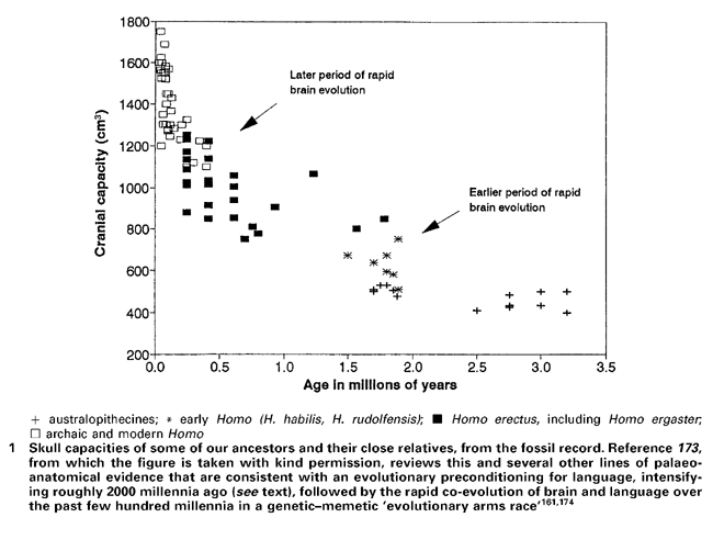 change, probably hundreds of millennia at least. This well explains the second period of rapid brain expansion, seen at the left of Fig. 1, what Christopher Wills161 has called the `runaway brain' phenomenon.
