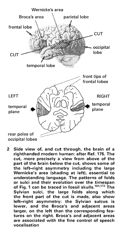 The first period of brain expansion, from roughly 2000 millennia ago, seems likely to have been associated with a preadaptation for language, rather than with anything like language as we know it. Such preadaptation seems likely to have involved vocal as well as visual (facial and gestural) communication - all highly advantageous under the pressure to increase group size, even if for no other purposes, at first, than social bonding and simple forms of signalling. Reference 173 makes a cogent palaeoanatomical case for just such a preadaptation, pointing out first of all that the characteristic brain asymmetries, illustrated in Fig. 2, were already present 2000 millennia ago, even though brain size was much smaller, suggesting